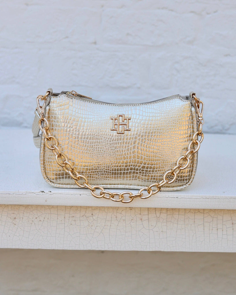 The Joan Crossbody in gold. This fabulous vegan pebbled leather crossbody is a wonderful size for travel and everyday wearing! It is made with a pebbled, vegan leather that is oh so soft. There is a removable chain accent that can also be used as a carrying strap as well. The crossbody strap is adjustable and removable as well. It features the Caroline Hill logo on one side and has a top zipper closure. The interior of the bag has a zippered pocket and two short open pockets as well. Dimensions: * 5.5" tall by 9.5" wide * 2" Base