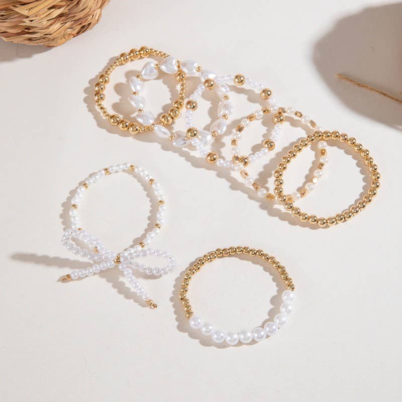 Multi-Layer Ball Chain Bead Pearl Bow Bracelet, this bracelet features multiple layers of sleek ball chains and beads, accented with lustrous pearls and a bow charm . Its layered design creates a stunning visual effect, making it a must-have. DIMENSION: length: stretchable metal finish: Gold Plating product: Lead & Nickel Compliant anti-tarnish: Double E-coating