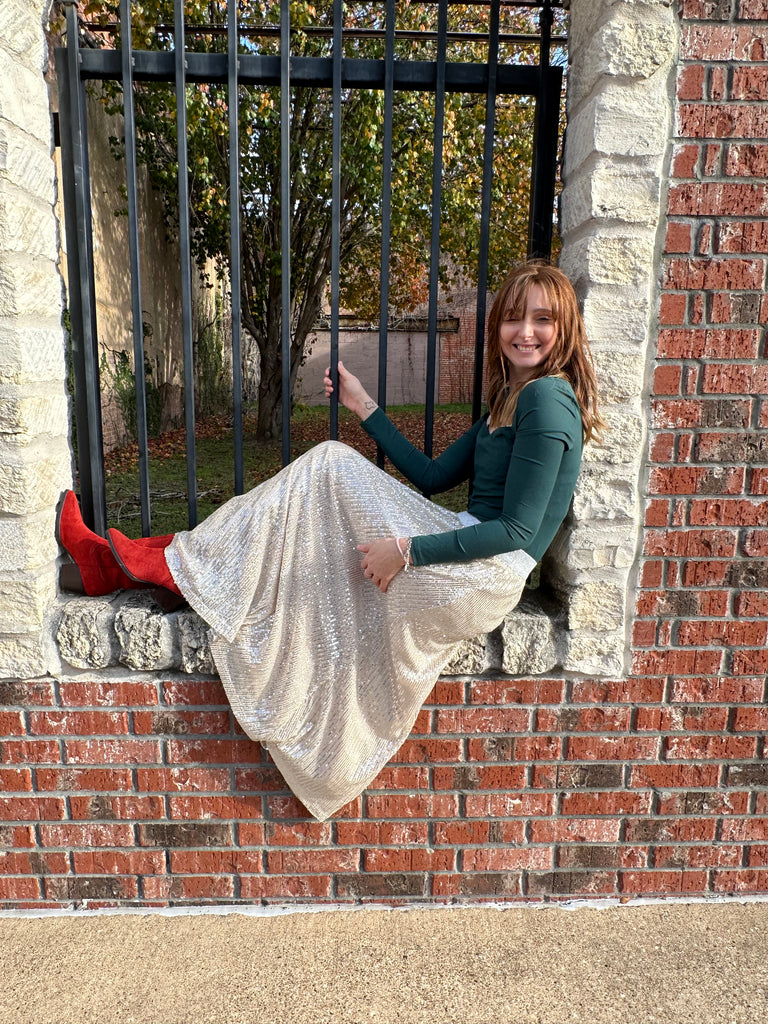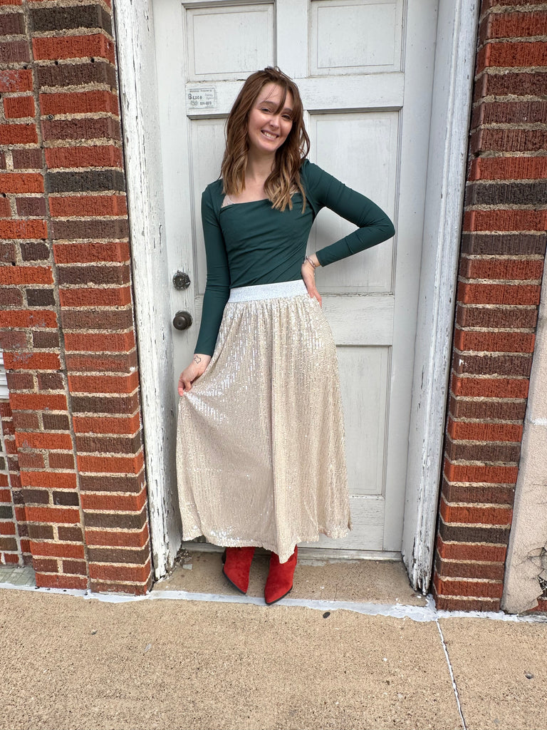 This ivory sequin maxi skirt adds a touch of shimmer and sway to your wardrobe. Its versatile elastic waist allows for a comfortable and flattering fit while the sequins add a festive touch, making it perfect for any New Year's celebration or special occasion.