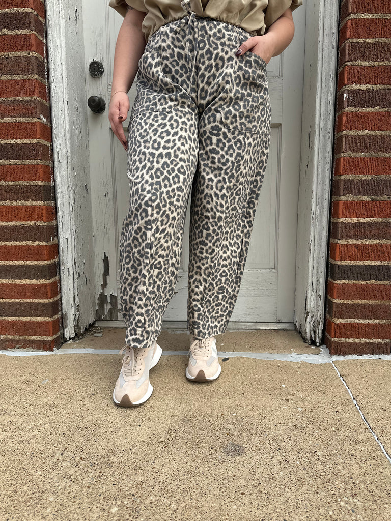Effortlessly stylish and practical, these leopard print pants feature an elastic waist for a comfortable fit, a waist tie for added flair and convenient front and back pockets for all your essentials. Barrel style twill pants