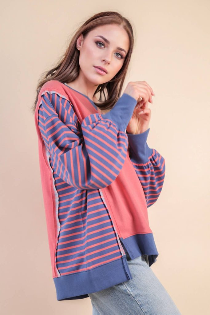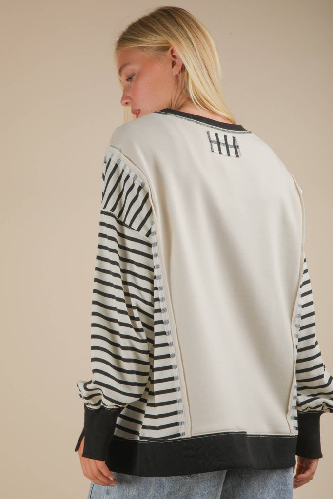 Unleash your cozy and chic style with our Loom and Lined Pullover! This black and cream oversized striped knit top features a round neck and drop shoulder for ultimate comfort. Its unique front and sleeve slits add flair while the hi-lo hem creates a flattering silhouette. Perfect for a casual day out or lounging at home.