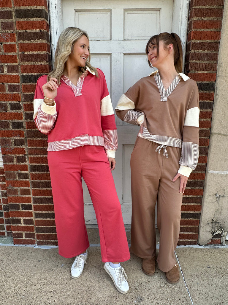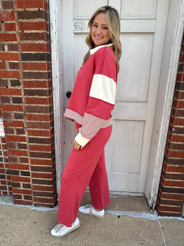 Elevate your seasonal wardrobe with the Classic Comfort Set in striking red. This thoughtfully designed two-piece ensemble combines contemporary styling with everyday wearability. The oversized collared knit top features long sleeves and a relaxed silhouette that flatters various body types, while the coordinating wide-leg pants offer an elastic waist with adjustable tie closure for a customized fit. Practical side pockets add functional appeal to the bottom piece. Crafted from quality knit fabric, this set transitions seamlessly from holiday gatherings to casual outings, delivering both comfort and polished style. Perfect for those seeking an effortless yet put-together look that doesn't compromise on ease of wear.