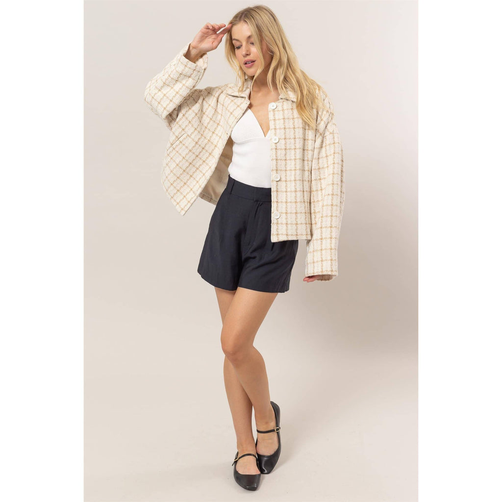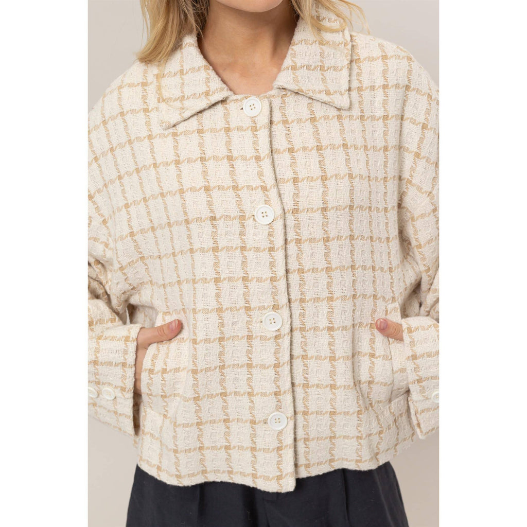 A soft, textured grid jacket that brings effortless polish to any outfit. The Briar Check Jacket features an easy, relaxed fit with a button-front closure, classic collar, and drop-shoulder sleeves. Lightweight but cozy, it layers beautifully over tees, tanks, and basics. Neutral tones make it a wear-with-anything essential from fall through spring.