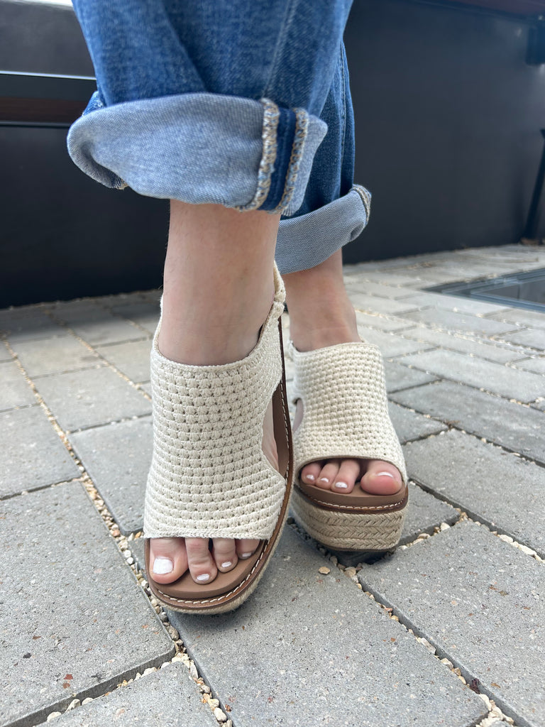 The “Freddie Wedges” are here to stay! We love this fun and sassy style with a crochet top in natural color that is perfect to complete so many looks! The wedge is wrapped in a beautiful raffia making this the perfect neutral wedge for your wardrobe, and the signature Corky’s memory foam sole makes them comfortable for all day wear. We love the slightly squared toe box!