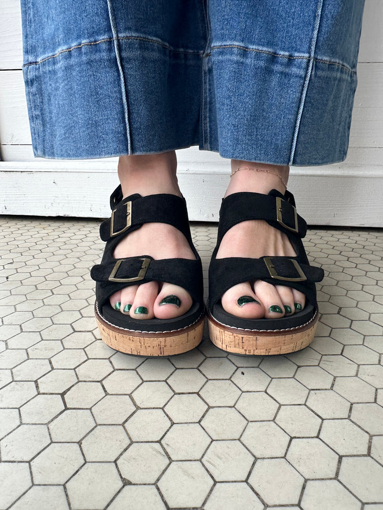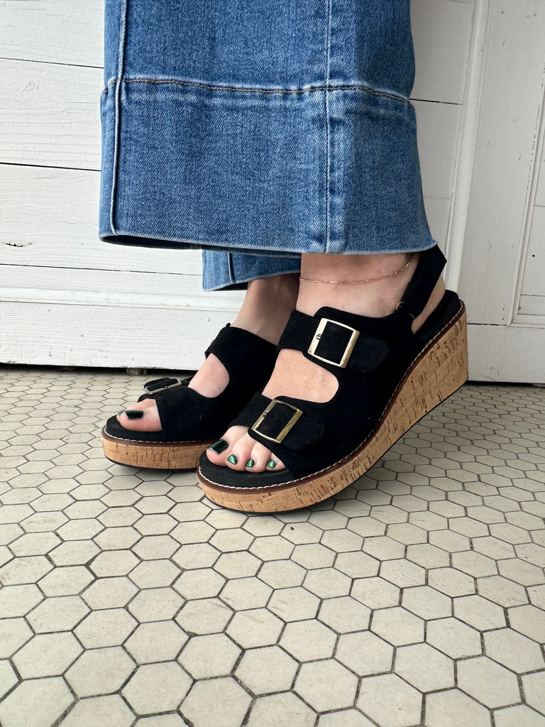 Experience the same comfort and style that Corky's is known for with our My 2 Cents Wedges in Black Faux Suede. Featuring elegant gold buckles and an adjustable slingback heel strap, these wedges are perfect for any occasion. The matching color memory foam adds a touch of sophistication to your look.