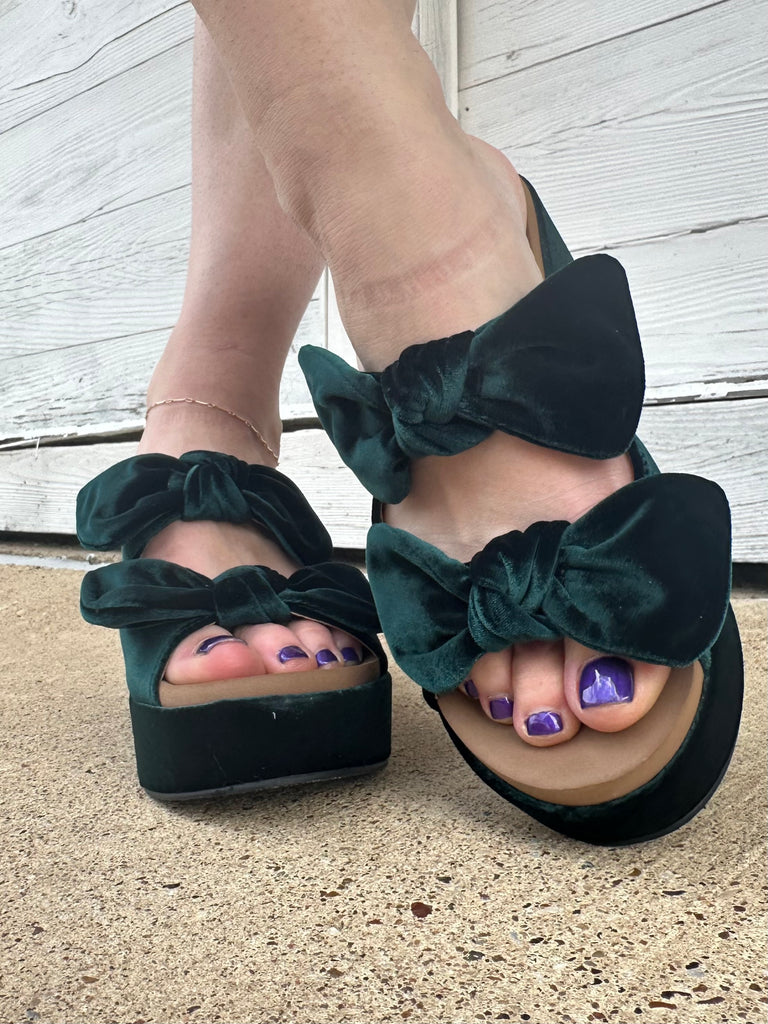 Put A Bow On It Heels are a perfect addition to your wardrobe! These beauties feature our best selling double bow strap and amazing Corky’s comfort you know and love with a memory foam sole. We love the beautiful green velvet material and chunky heel. These are perfect for the Holidays!