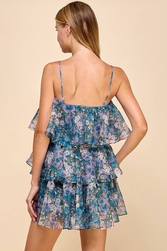 Tiered ruffle, floral printed organza dress with adjustable/ removable spaghetti straps and a concealed back zipper.