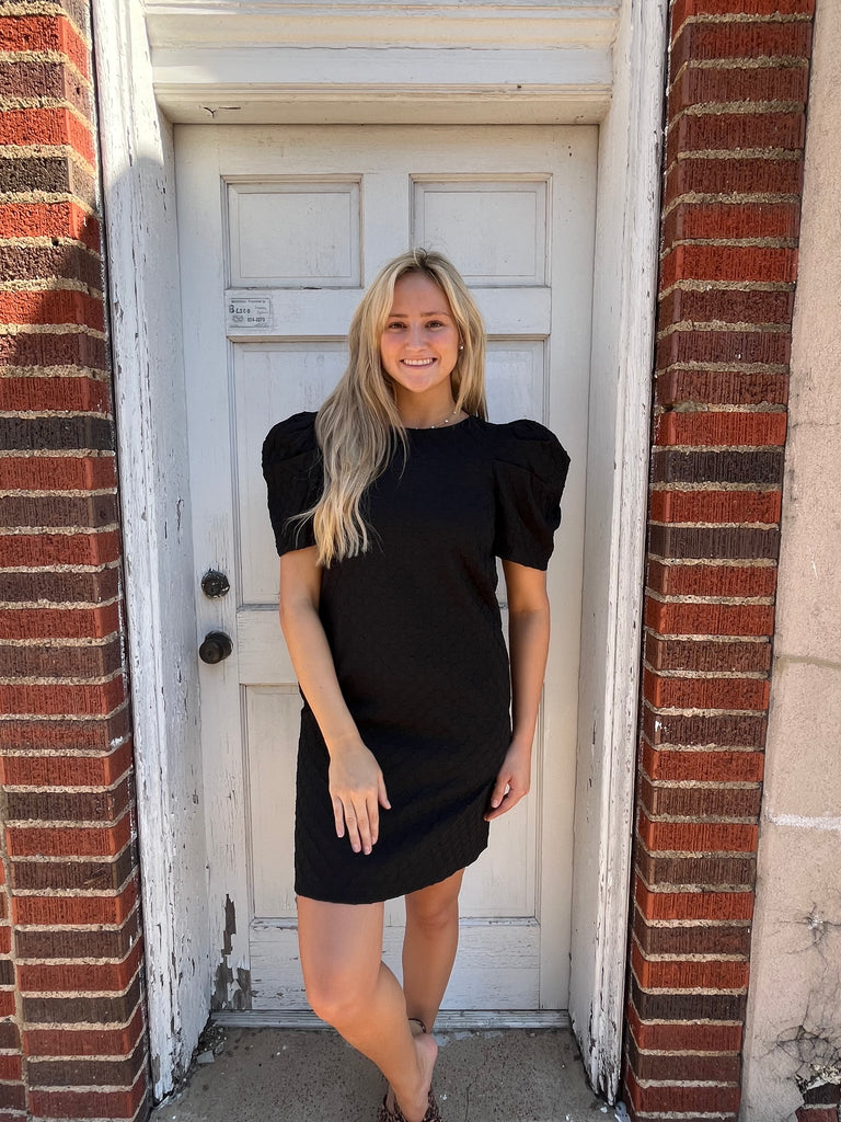 Make a statement without saying a word. This textured black mini dress features bold puff sleeves and a sleek silhouette for the perfect balance of drama and sophistication. Whether it’s a night out, cocktail party, or a special dinner, this little black dress guarantees you’ll stand out in style.
