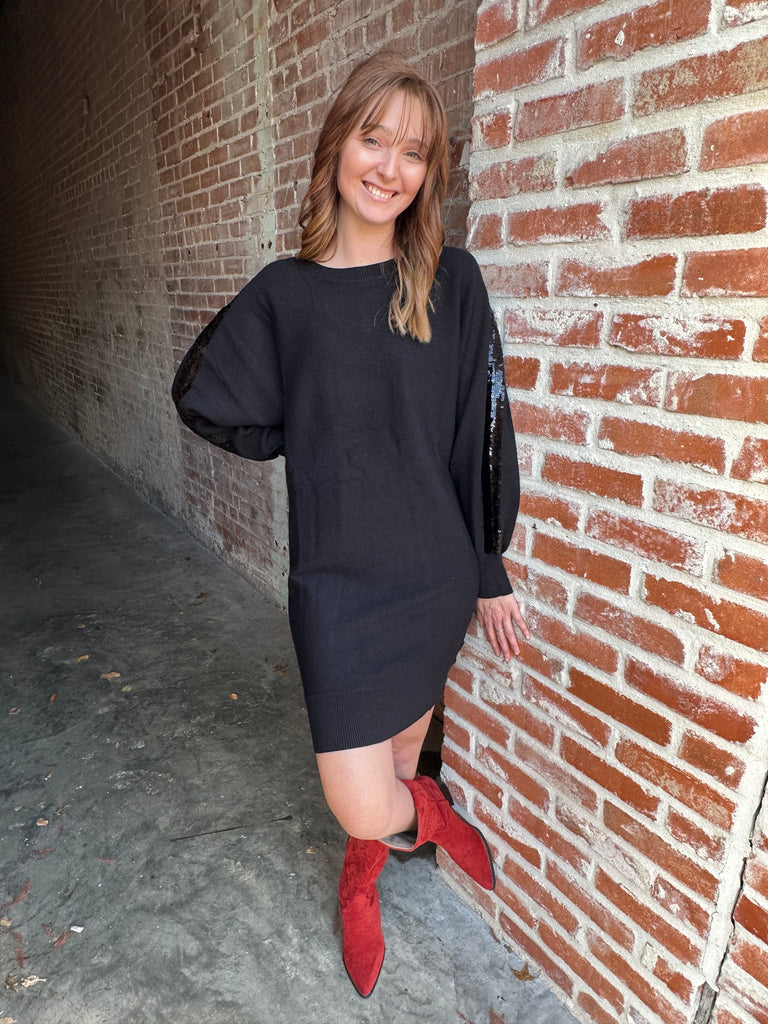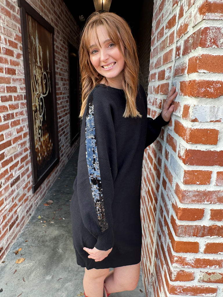 Introducing the Line and Shine Dress in classic black. This dress boasts a ribbed crew neckline with a contrast embroidered sequin accent for added glam. The dolman long-sleeve ribbed hem provides a comfortable, relaxed fit in a bodycon silhouette. Perfect for any occasion, from everyday wear to holiday parties and office work.