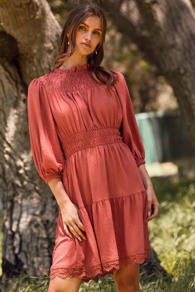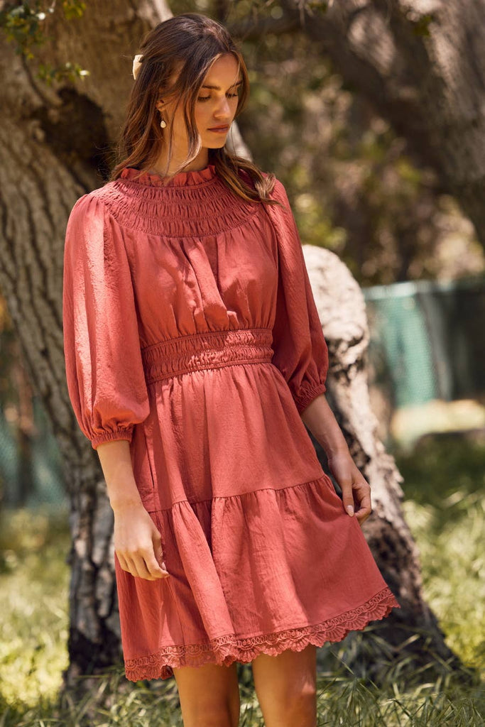 Effortlessly exude a sense of calm and grace with our No Need to Rush Dress in Rose. Designed with solid airflow fabric and 3/4" sleeves, this mini dress features a smocked yoke and delicate lace trim hem. Embrace the ease and beauty of this dress for any occasion.