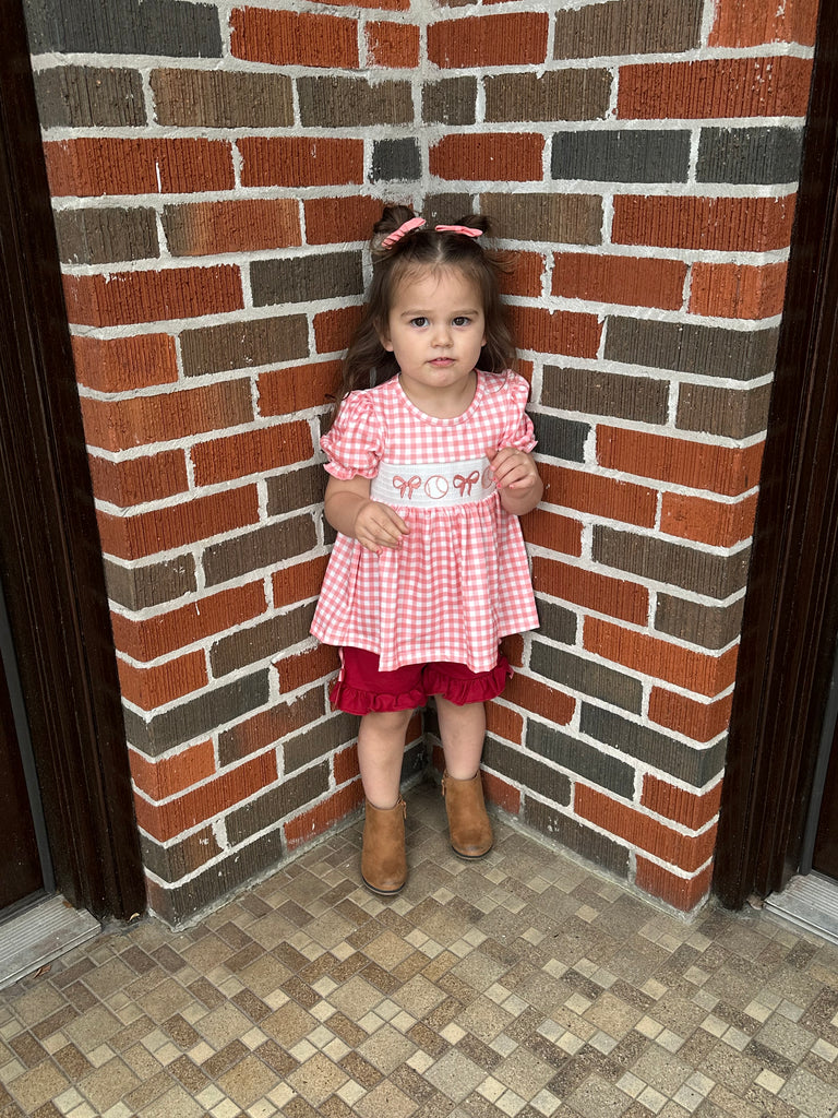 Two piece smocked set with baseball theme in a pretty coral gingham that pairs well with burgundy mix, shorts and bow details. For girls