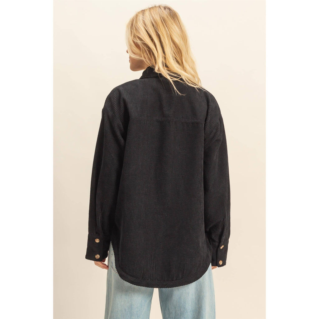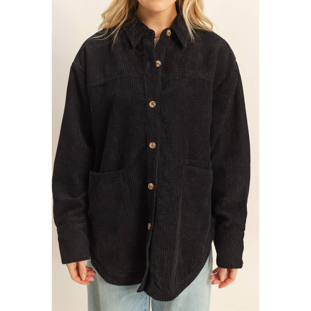 This timeless outerwear features a structured silhouette with a pointed collar and prominent front pockets, making it an ideal choice for layering over casual ensembles. The corduroy texture enhances the tactile appeal, offering a stylish solution for chilly evenings or transitional weather. Pair with slim jeans and ankle boots for a harmoniously stylish look, or throw over a dress to add a touch of sophistication to your daytime adventures. 97% polyester 3% spandex Model Is 5' 6" Tall, 32" Chest, 24" Waist, 32" Hips And Wearing A Size Small Imported. Designed In The USA