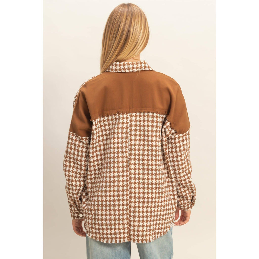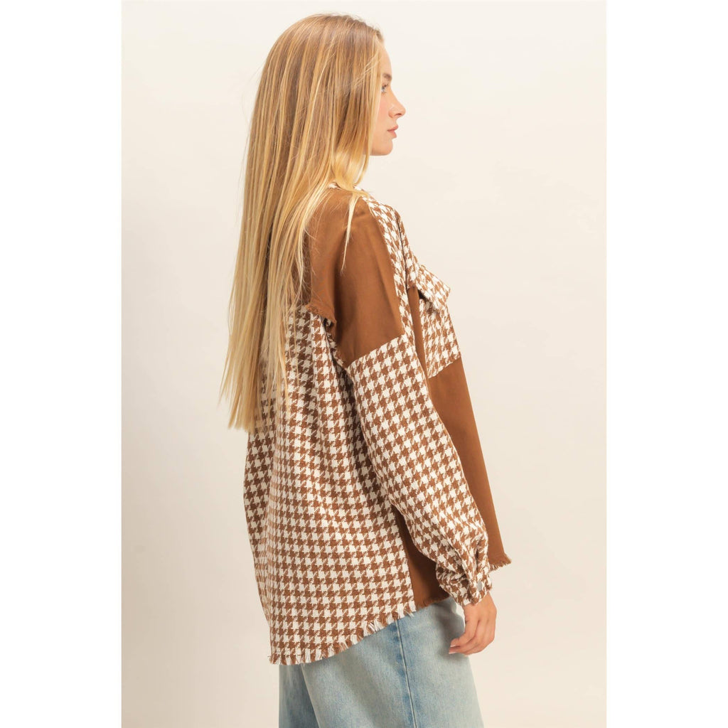 A bold mix of classic and modern. The Bristol Shacket pairs rich camel-brown fabric with a standout houndstooth print for a high-end, boutique-exclusive look. Features front pockets, raw hem detailing, and a relaxed silhouette. The contrast pattern elevates even the simplest outfit.