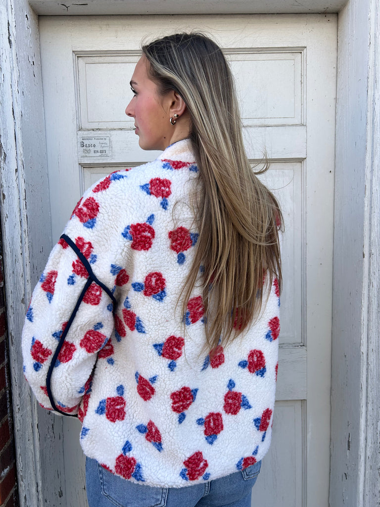 The Regal Rose Fleece Jacket boasts a cream and red color scheme and features a high neck, front zip-up closure, long sleeves, drop shoulders, and convenient side pockets.