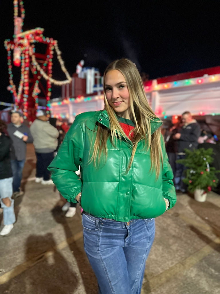 Stay warm and stylish with our faux leather turtle neck cropped puffer jacket. It has both a zipper closure as well as snap buttons. There is also a drawstring on the inside if the bottom hem. Its lined on the inside so you're sure to stay protected from the fall and winter weather.