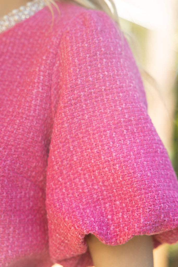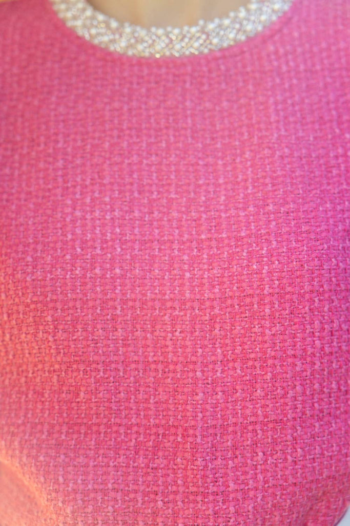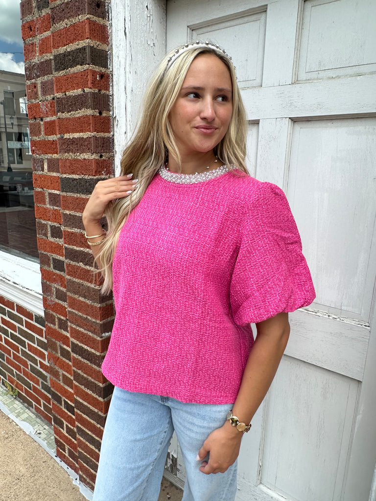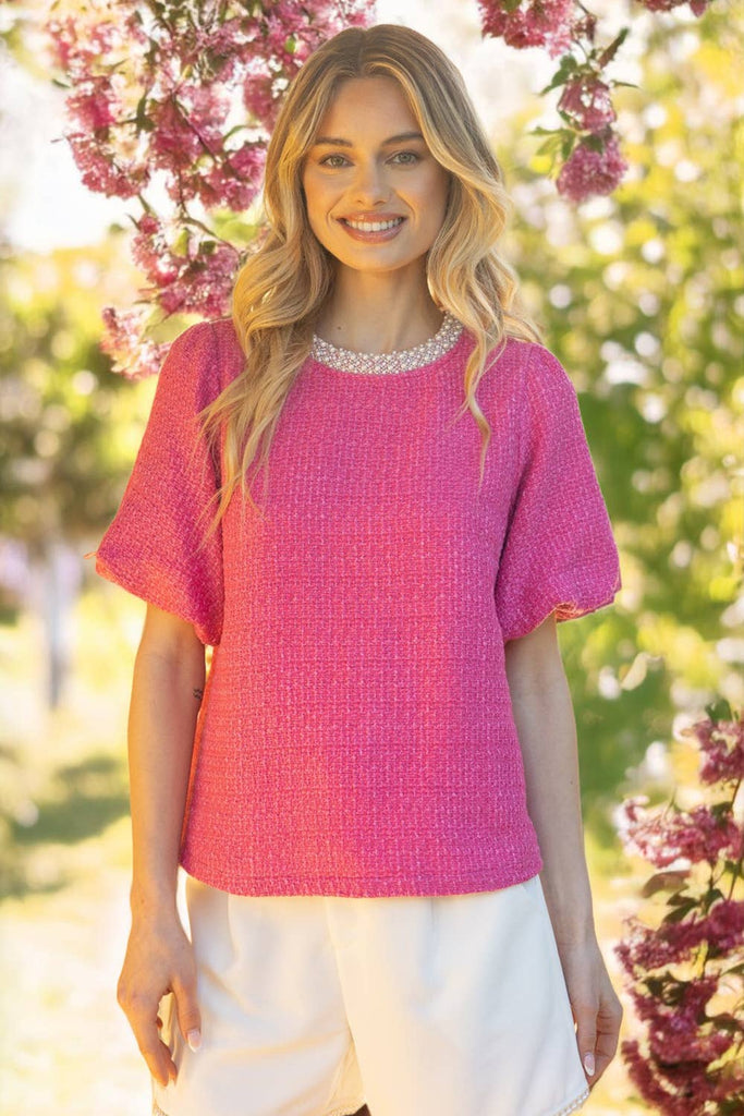This top features elegant pearl trim detailing around the neck band and is finished off with a secure back neck button and loop closure. The bubble short sleeves add a touch of femininity while the solid tweed fabric creates a classic and sophisticated look. Designed for versatility, it can be dressed up or down for any occasion.