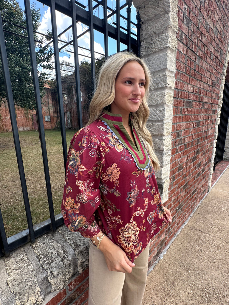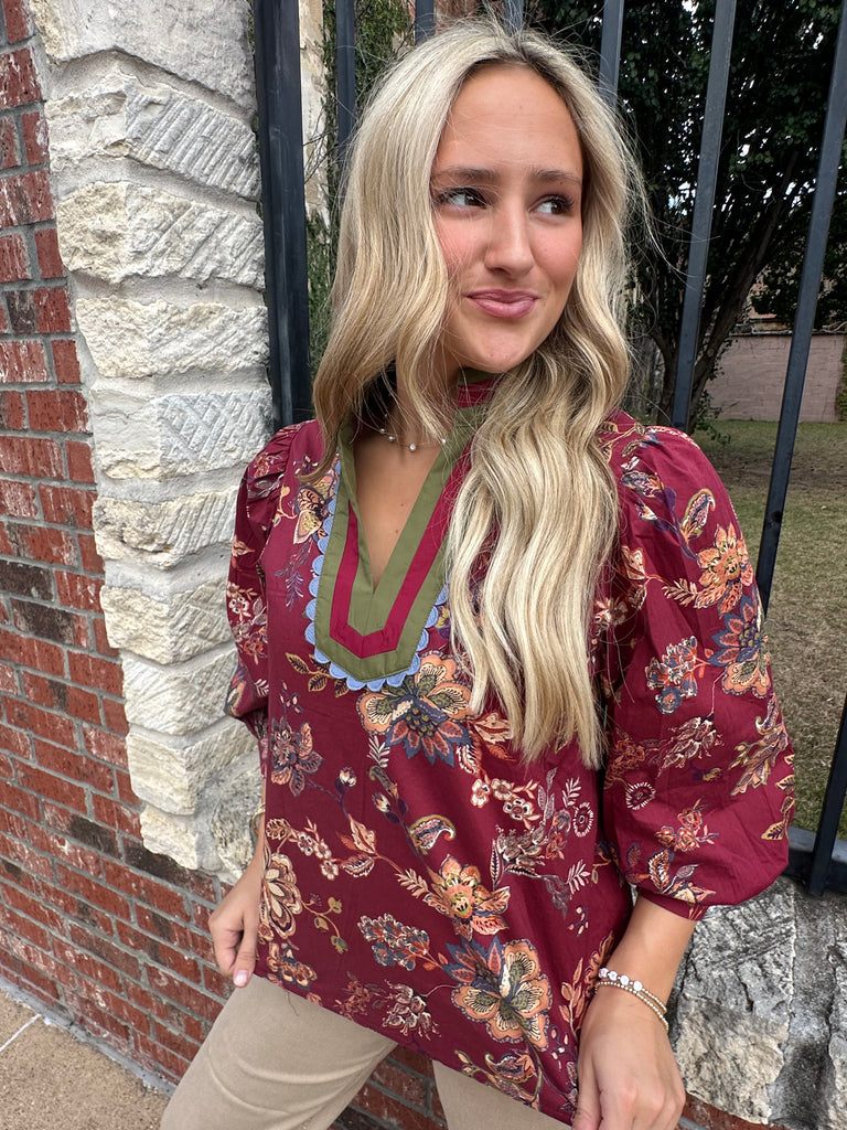 Introducing our Falling For You Top PLUS in Maroon. This plus-size top features a delicate floral pattern with elegant green trim, making it a must-have for any wardrobe. Elevate your style with this sophisticated and exclusive piece that is sure to make you stand out.