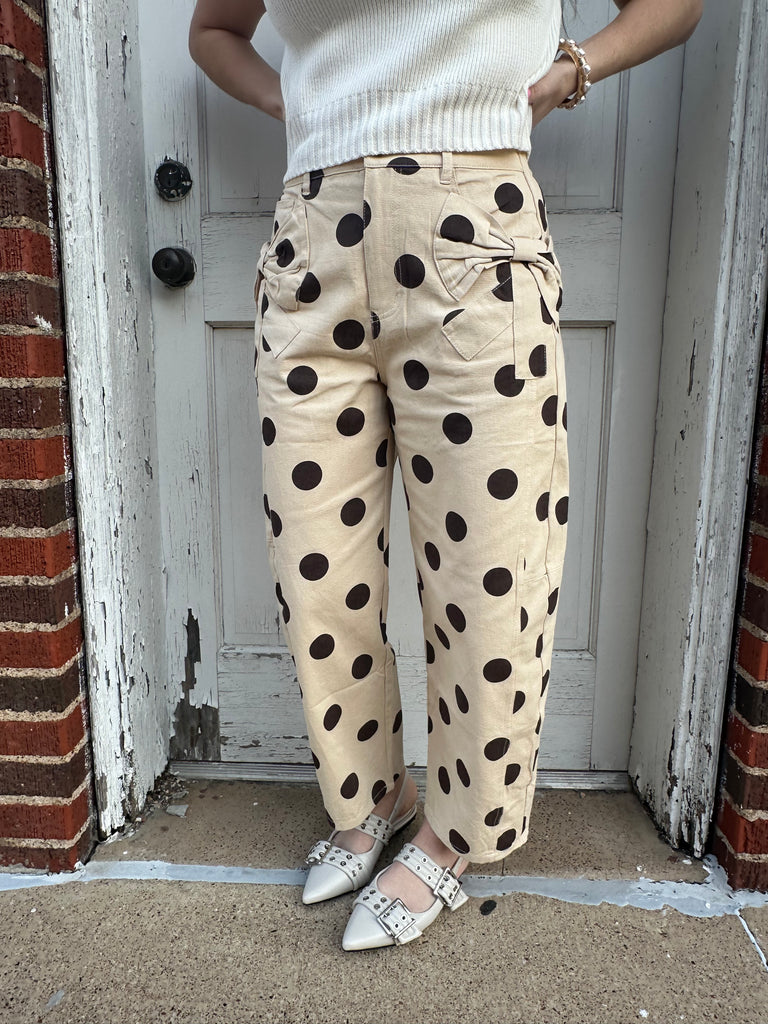 Polka dot printed barrel denim pants with bow pocket. Also available in sizes S to L: Style no. IP18301. Total Length: 39" Content: 65% Cotton, 35% Polyester