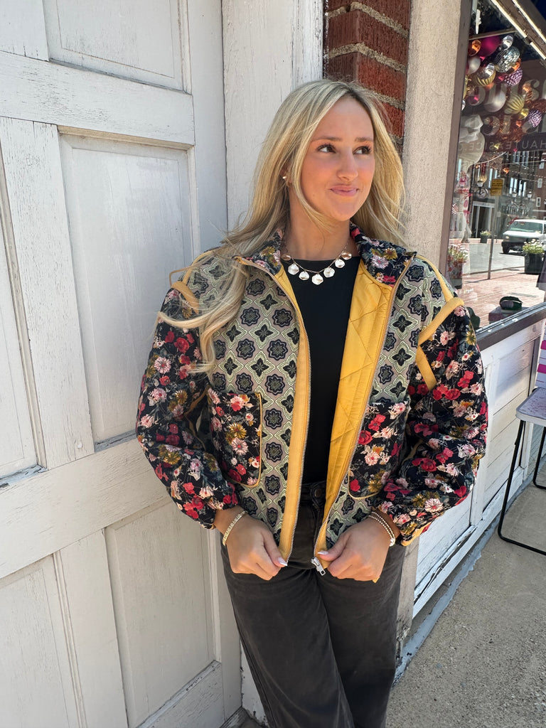 Introducing our Golden Hour Blooms in Marigold - charm and fashion collide in a cozy and chic statement layer. Featuring a golden mustard lining, patchwork-inspired floral sleeves, and bold patterns, this jacket adds a touch of bohemian soul to any look. Perfect for dressing up or down with denim or basics.
