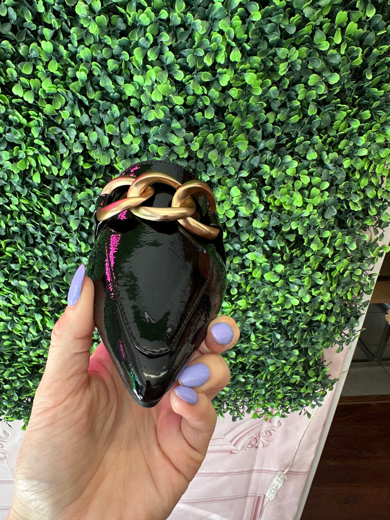 Playin’ for Keeps Mules are a stand out with a gorgeous black patent material, pointy toe and accented with a worn gold chain!