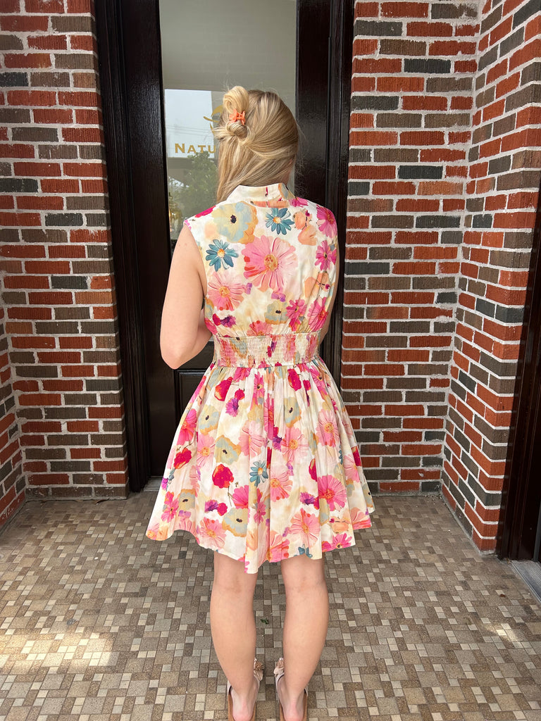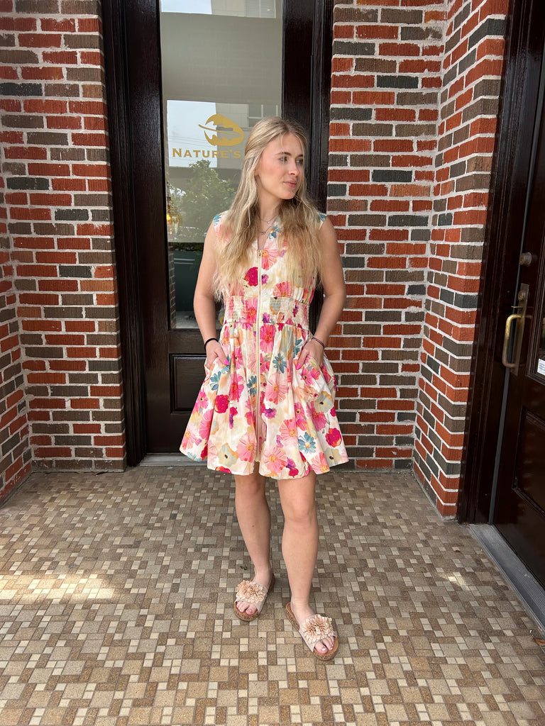 “Blush & Bloom” in this gorgeous dress! We love the pattern and the style with a zip up front and elasticized waistline. This pretty dress exudes femininity and is suck a compliment to all frames.