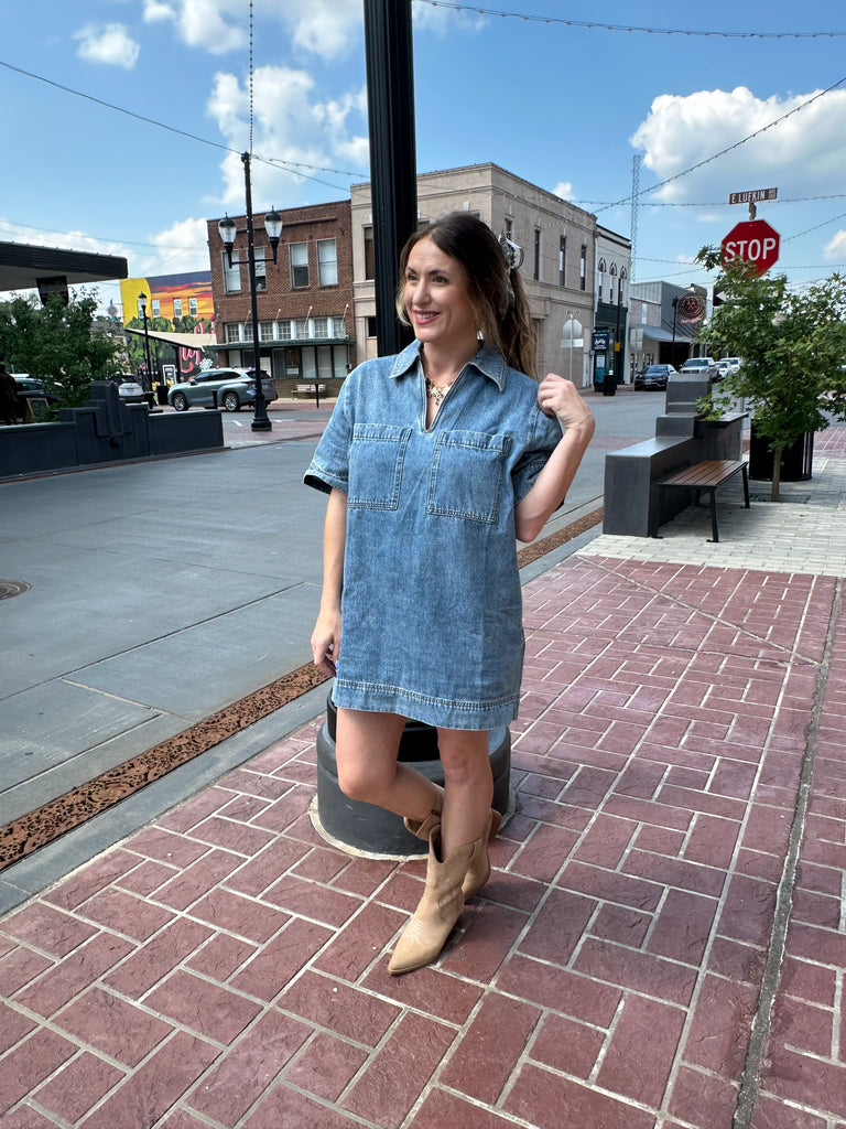 Meet your new go-to for effortless style — The Southern Stroll Denim Shift. This easy-fit denim dress features a relaxed, oversized silhouette with short sleeves and classic utility-style chest pockets. Designed with a flattering collared neckline and just-right length, it pairs perfectly with your favorite boots or sneakers. Whether you’re strolling downtown or heading to brunch, this dress brings timeless charm and casual confidence to every step.