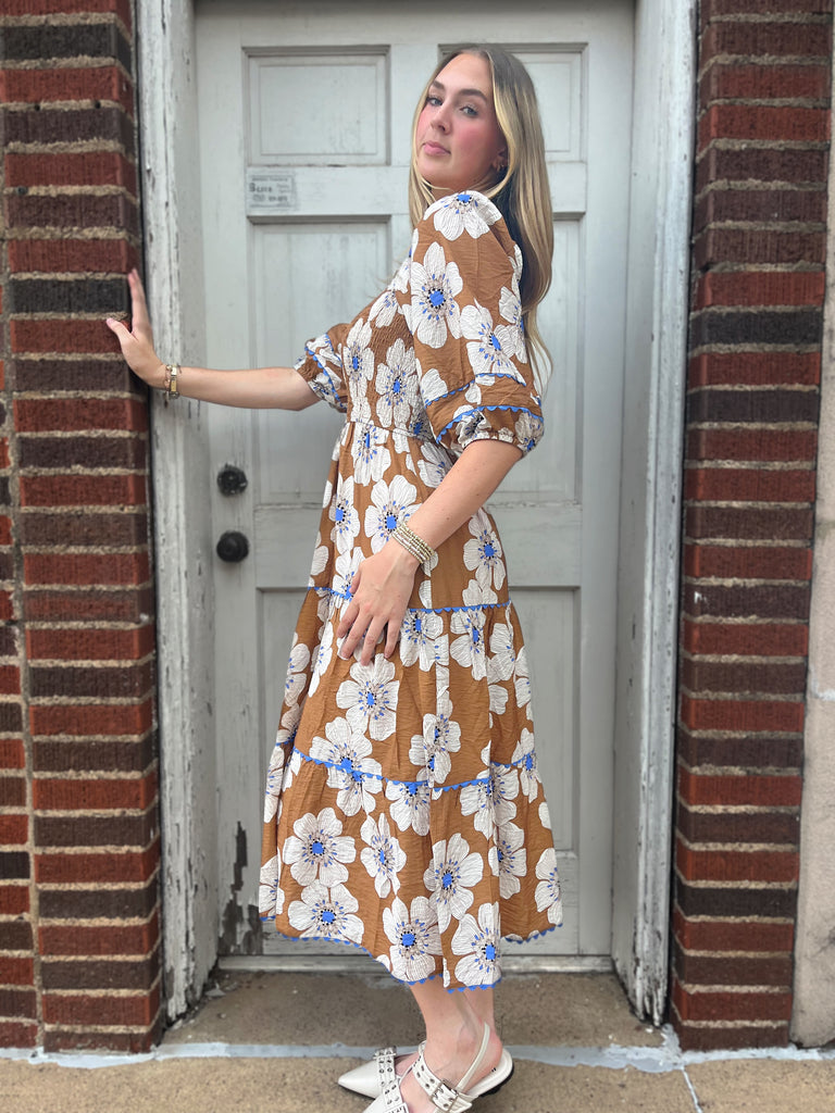 FlFloral printed tiered midi dress featuring puffed sleeves and a smocked bodice. This dress is perfect for any occasion. The floral print adds a touch of femininity and the tiered design creates a flattering silhouette. The puffed sleeves and smocked bodice add a trendy and stylish touch.