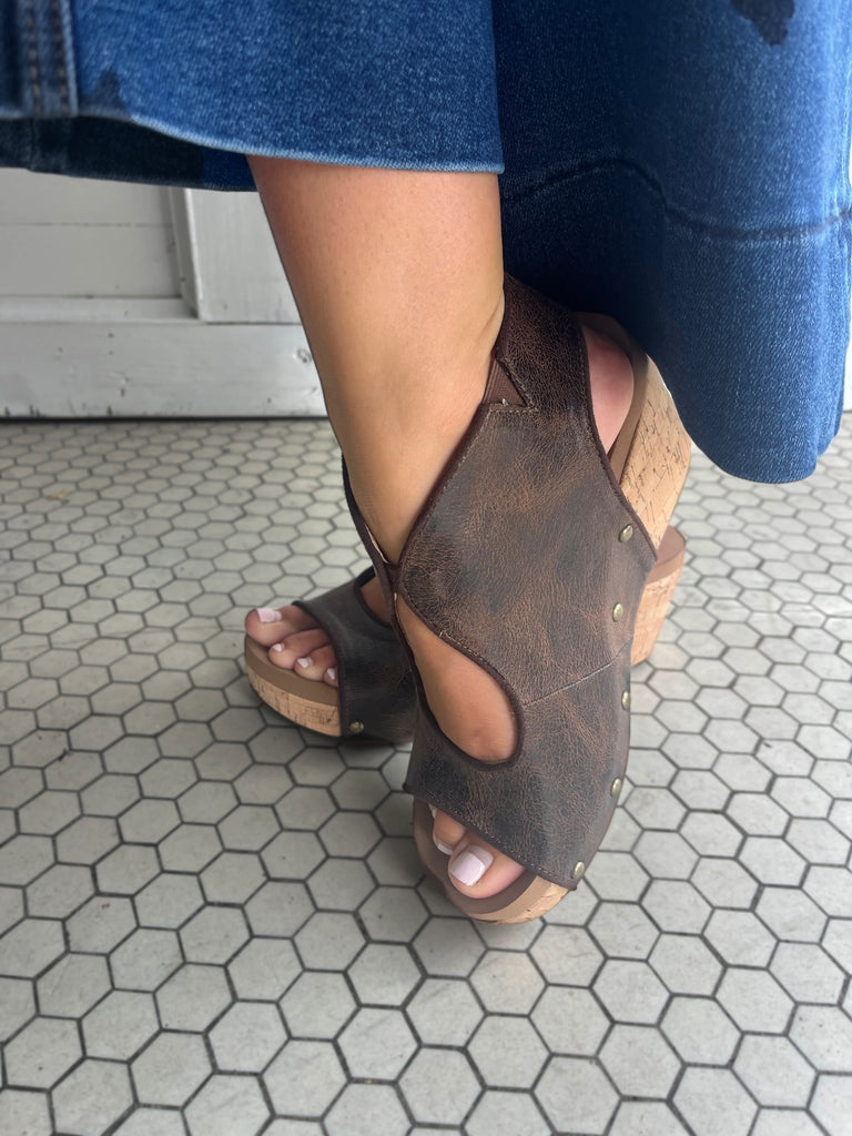 Elevate your style game with Frisky Wedges - a must-have addition to your shoe collection. Experience the luxurious texture of espresso crinkle fabric, perfectly complemented by the timeless shape of our Corky's Wedge. The perfect combination of fashion and comfort, these wedges will elevate any outfit and flatter your feet.