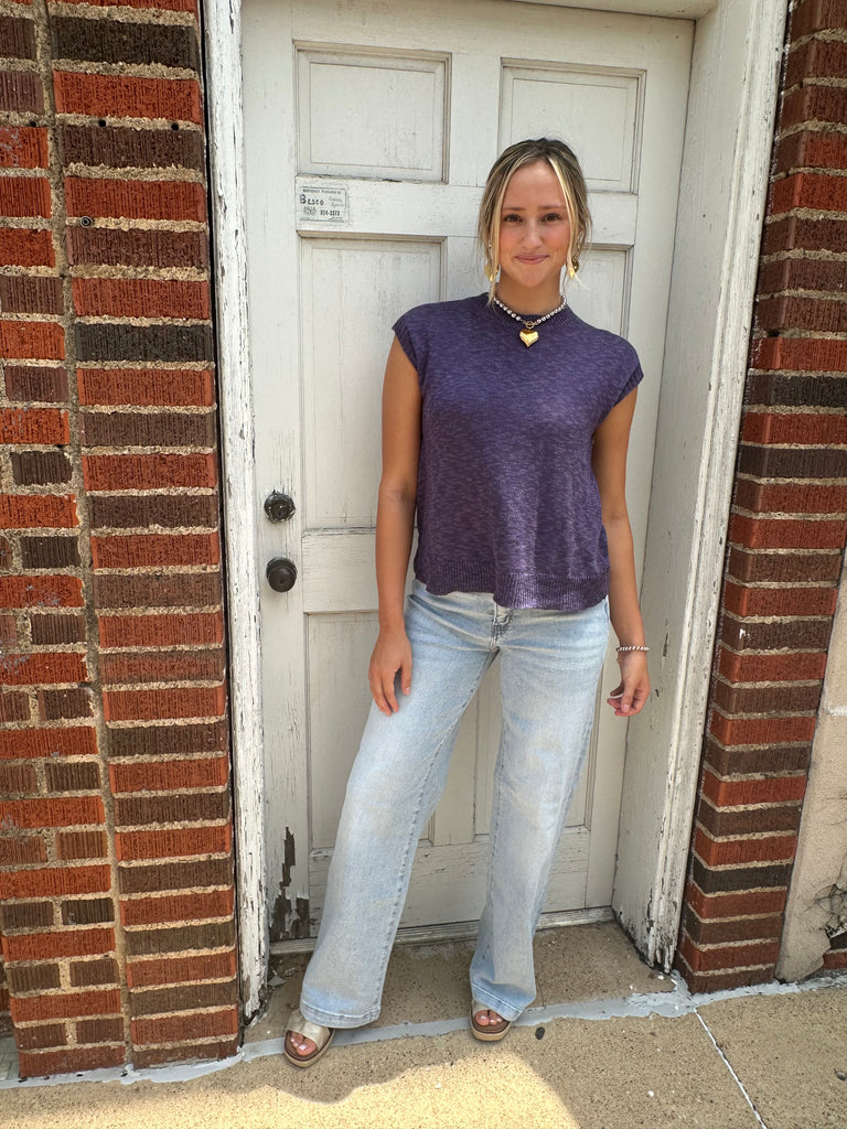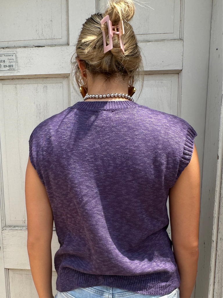 knit top, knit vest, layering piece, ribbed hem detail, sleeveless top, minimal style, loose fit silhouette, crew neckline, solid color top, everyday look