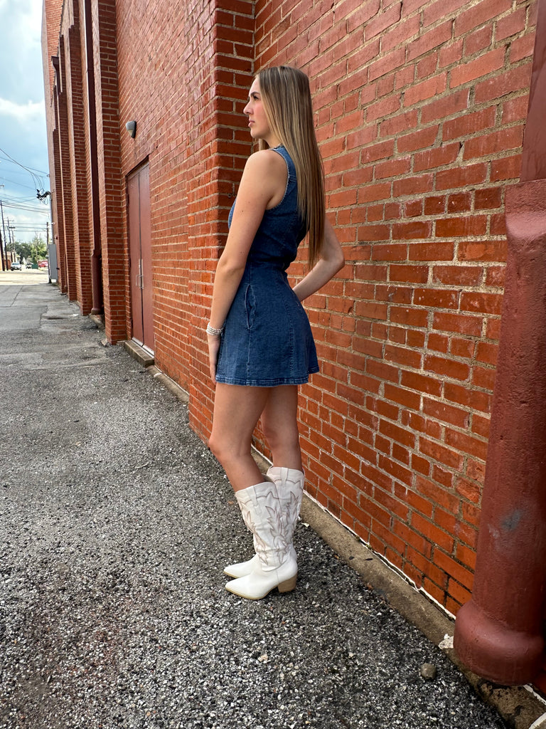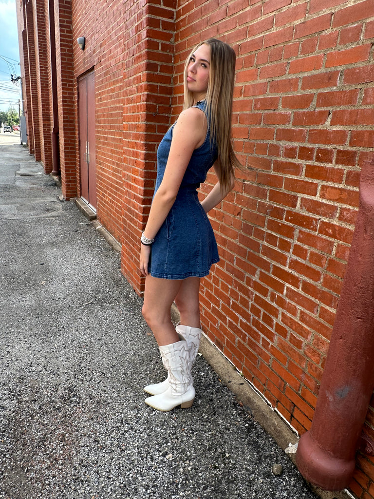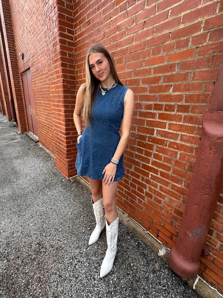 This denim round neck dress is the perfect addition to your wardrobe. Made with high-quality denim fabric, this All-American Girl dress offers both style and durability. Its round neck design adds a touch of sophistication, making it suitable for both casual and formal occasions. Elevate your fashion game with this versatile and timeless dress.