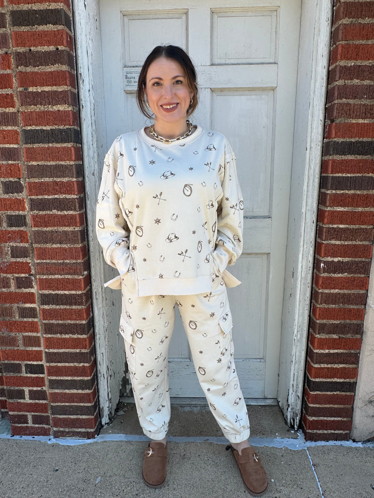 Cowboy motif printed french terry oversized long sleeve crewneck top. Total Length: 25" Content: 65% Cotton, 35% Polyester
