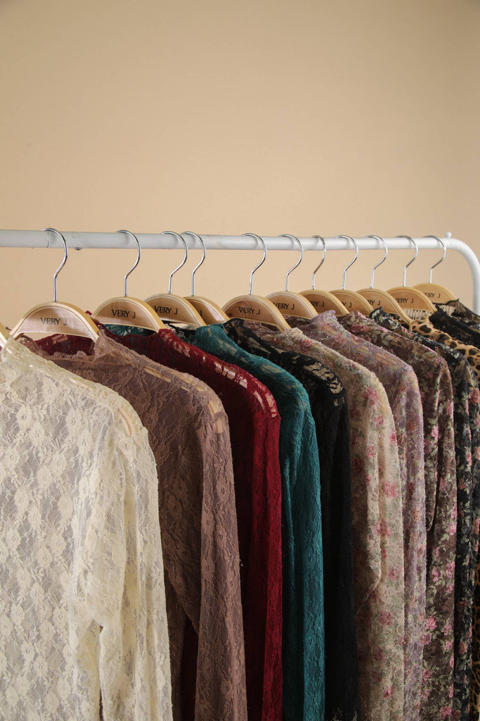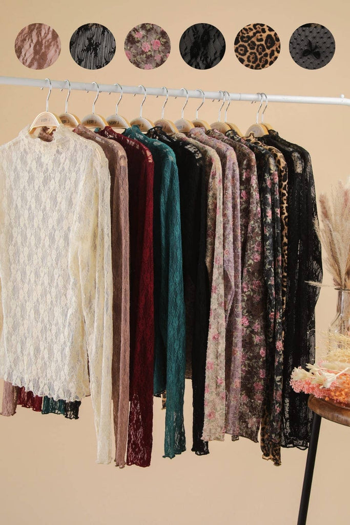 - High Neck Fitted Sheer Mesh Lace Knit Top - Solid, Floral, Bow, Stripe & Leopard Printed - Long Sleeve (Model height: 5'8", wearing a Small, 2-2-2 Size Ratio, NEW IN)