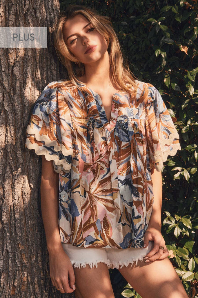 The Painted Petals Top in Taupe Blue Combo features a floral design complemented by a scalloped trim, enhancing visual appeal. The short sleeves make it suitable for warmer weather, making it an ideal choice for spring attire. This blouse combines style and comfort, appealing to fashion-forward individuals.