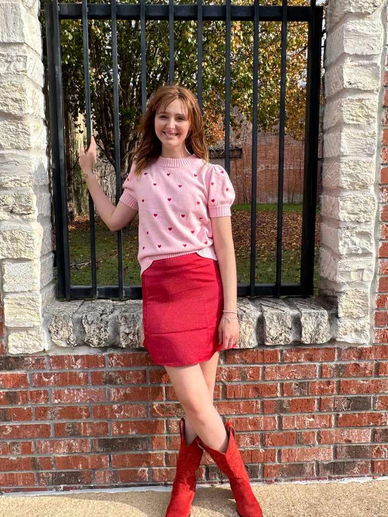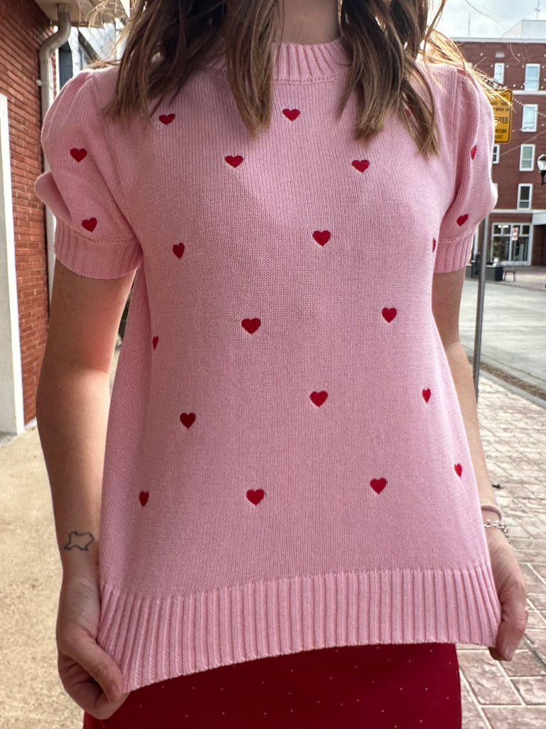 Introducing the Electric Lover Top in Pink. Fall in love with the charming hearts and trendy short sleeve design. Stay warm and cozy with the sweater material. The perfect addition to any fashion-forward wardrobe.