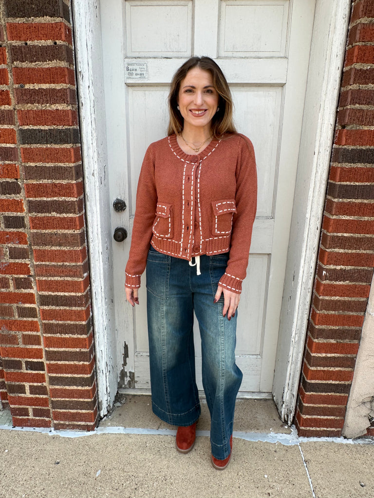 A modern take on a classic. This cozy textured knit cardigan stands out with contrast whipstitch detailing that traces the neckline, placket, hem, and pockets—bringing a handcrafted, vintage-meets-cool charm. The rich rust and olive tone makes it perfect for early fall layering, while the cropped cut keeps it playful and flattering. Finished with oversized buttons and front pockets, it’s the kind of piece that adds instant character to denim, dresses, or a matching knit skirt. Buyers love the unique stitch details and easy styling potential—don’t wait on this one. Features - Textured knit - Cardigan - Long-sleeves - Contrast stitch - Button-down - Round neck - Side patch pockets