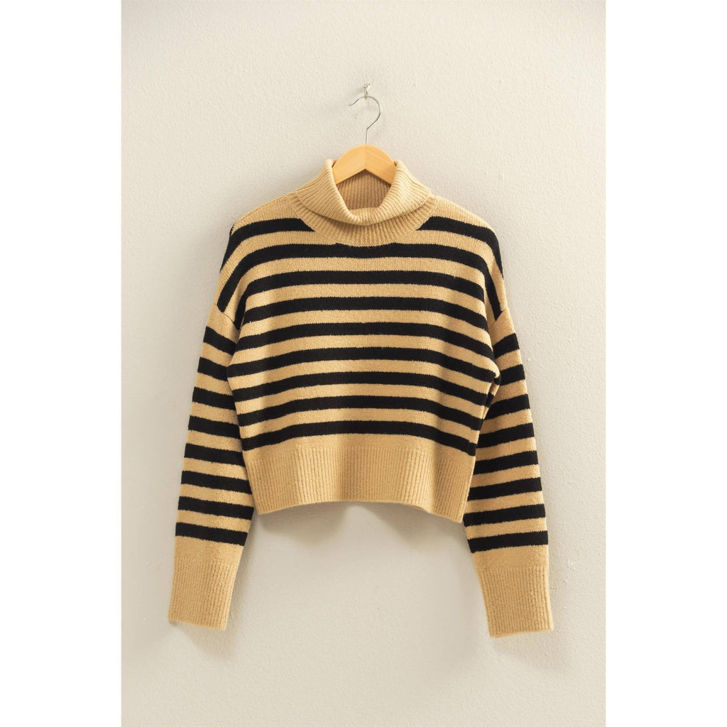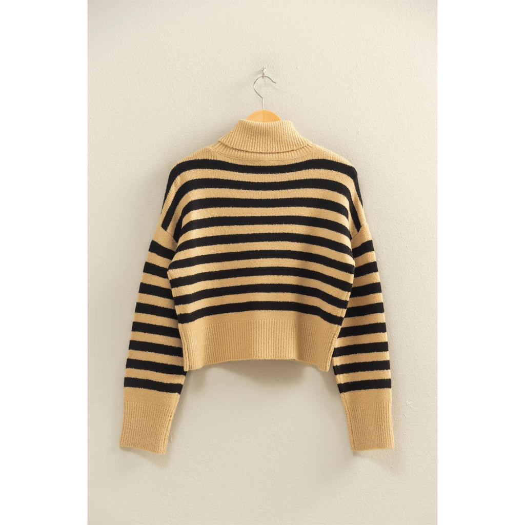 This striped sweater blends timeless appeal with contemporary flair, featuring a warm turtleneck and bold horizontal stripes. Crafted to enhance comfort, its relaxed fit makes it ideal for casual outings. For a stylish ensemble, pair with fitted jeans and ankle boots, perfect for a crisp fall day. Accessorize with a simple watch or a cozy scarf to elevate the look.