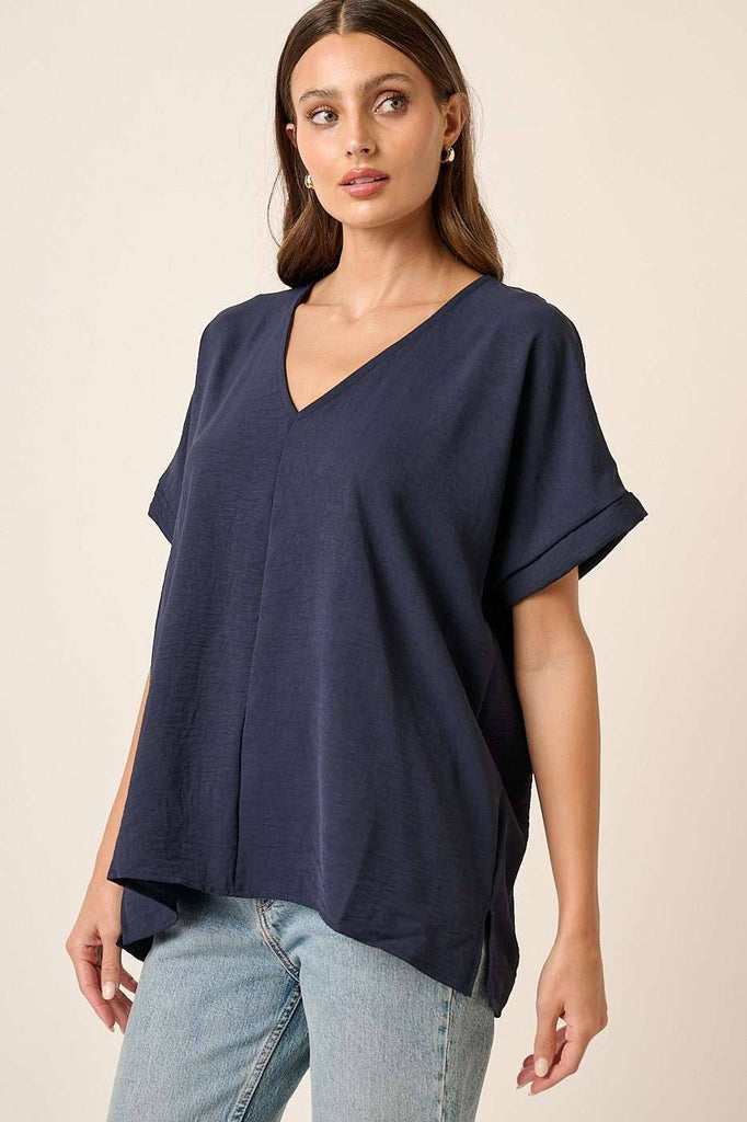 - AIRFLOW WOVEN FABRIC - V-NECK - DOLMAN SHORT SLEEVE - CUFF BAND FINISH SLEEVE: airflow, air flow, spring, summer, fall, basic, basics, tee, blouse, tshirt, dolman sleeve, loose fit, vneck, full size run