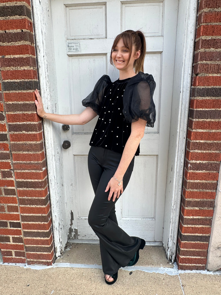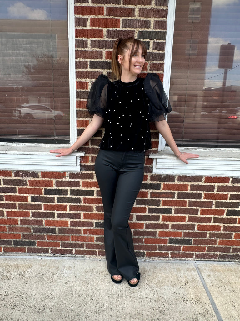 Velvet pearl embellished top with voluminous organza puff sleeves. Total Length: 20 " Content: 95% Polyester, 5% Spandex