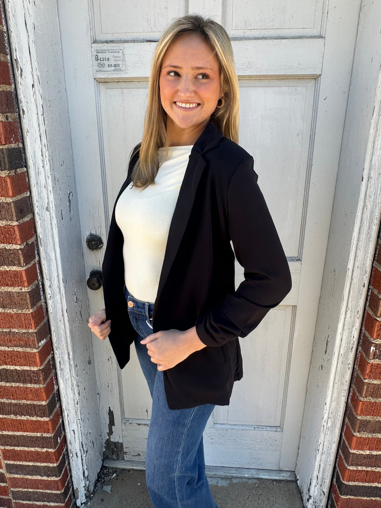 The Busy Woman Blazer in Black is designed for the modern professional, seamlessly blending business casual style with functionality. Its structured silhouette enhances the figure while offering comfort for all-day wear. Ideal for various work environments, this blazer promotes a polished appearance, reflecting contemporary trends in professional attire. Featuring a ruched 3/4 length sleeve for a versatile look.