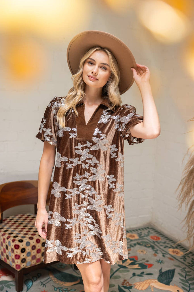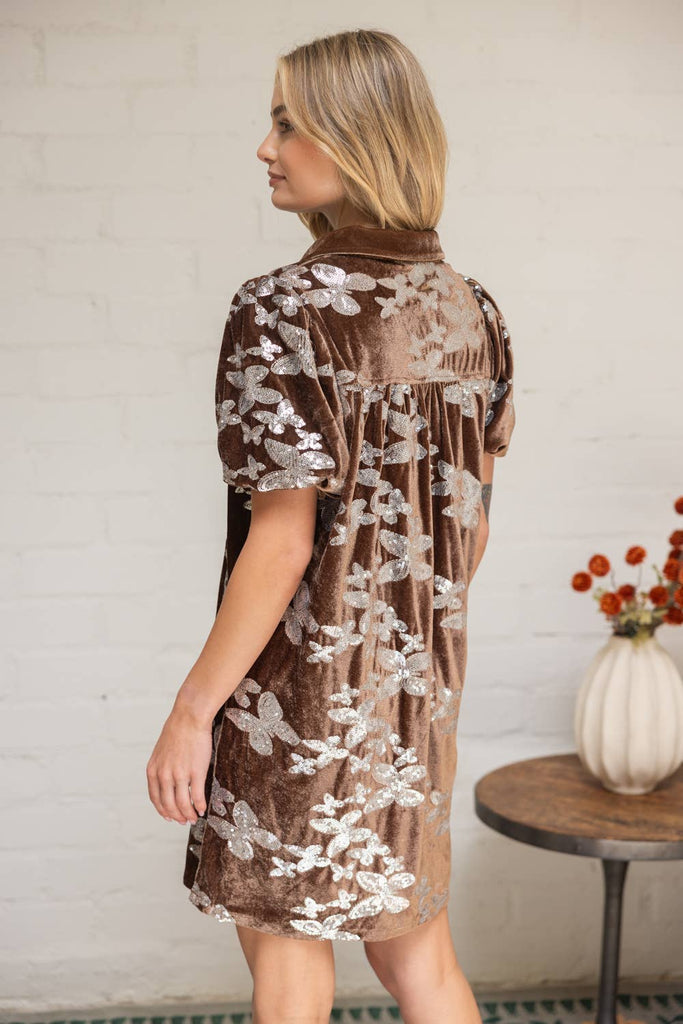 Shimmer meets sophistication in this luxe velvet dress with silver floral detailing. The soft brown base brings warmth while the metallic accents add a touch of sparkle—perfect for holiday parties, date nights, or fall gatherings. Style with boots and a hat for boho vibes or heels for an elevated evening look.