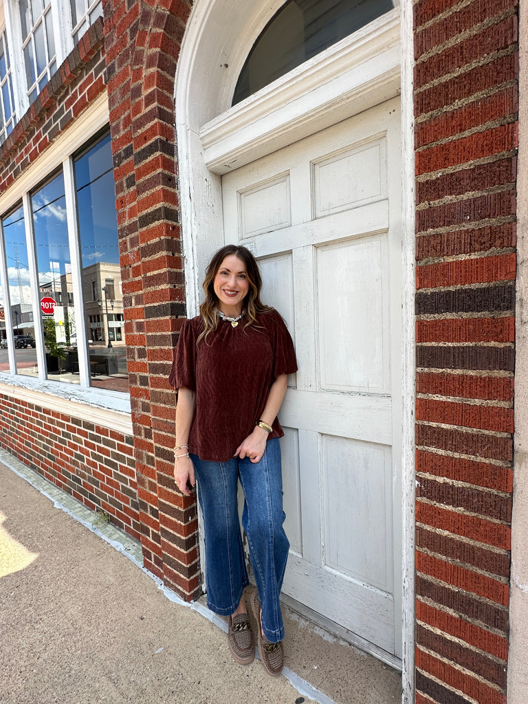 Effortless and elegant, this rust-toned blouse features soft pleated fabric and flutter sleeves for the perfect mix of chic and comfortable. Its lightweight flow makes it ideal for layering under cardigans or pairing with denim for a casual yet polished look. A must-have for transitioning seasons, this top brings just the right pop of warm color to your wardrobe.