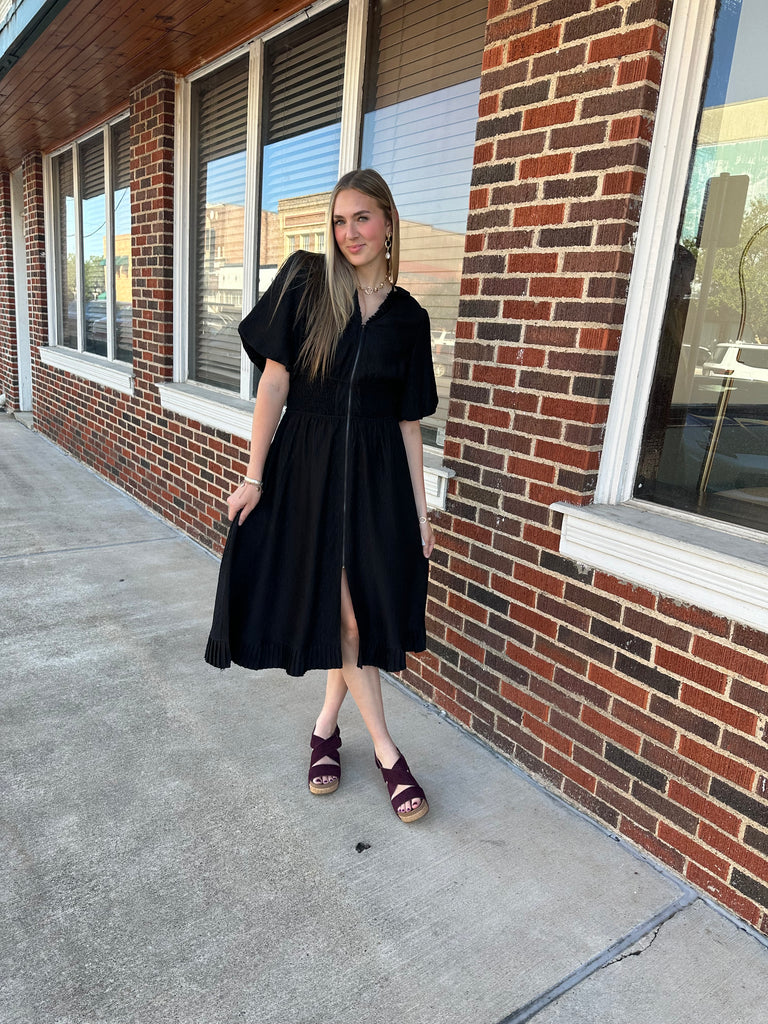 • V-neckline • Short bubble sleeve • Zipper front closure • Pleated collar and hem detail • Wide smocked waistline • Solid crinkly textured woven fabric • Size information: Model height 5' 8”, wearing size Small Pre-Pack size S-M-L / 2-2-2