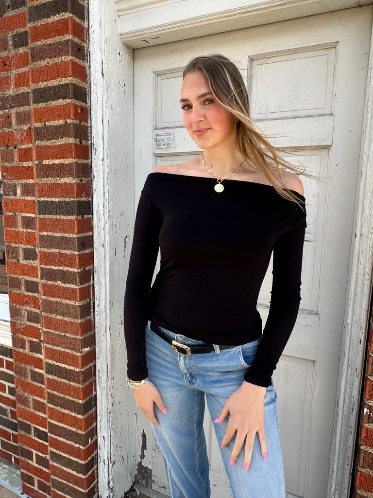The Chic and Chiseled Long-sleeve in black features a boat neck design and long sleeves, providing a contemporary look. Its tight fit enhances body contours, making it suitable for layering or standalone wear. This garment aligns with current fashion trends, appealing to style-conscious individuals seeking versatility in their wardrobe.