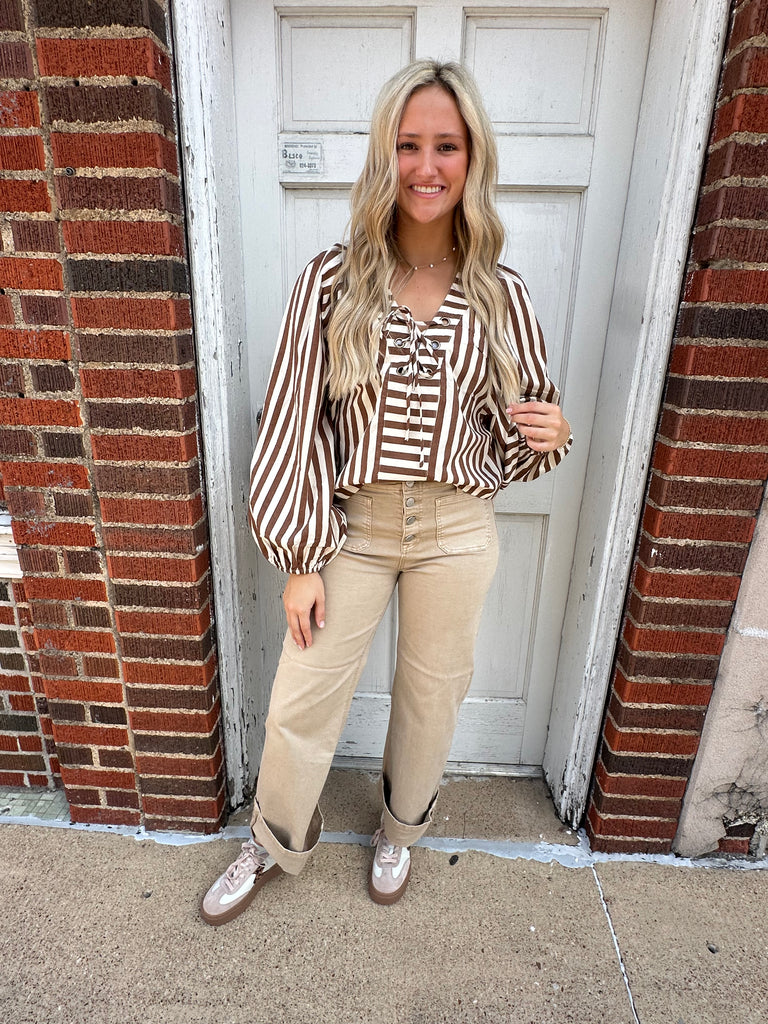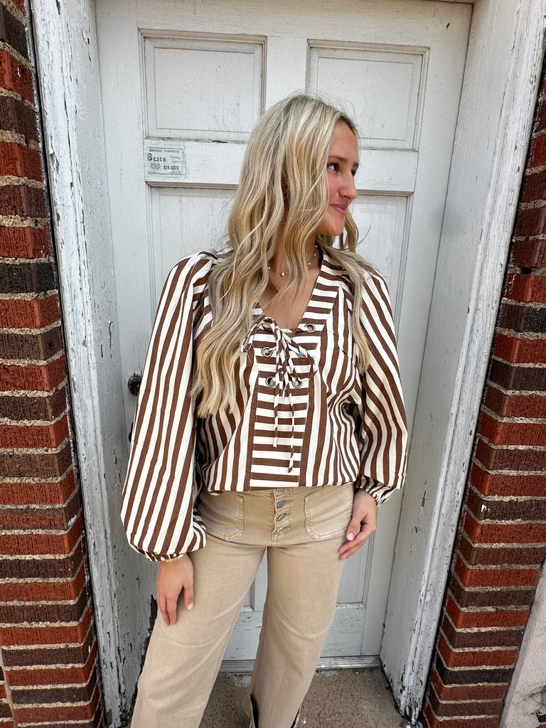 "Stay stylish and cozy this season with our Toffee Twist Top in a beautiful brown and cream striped design. This long sleeve top is perfect for adding a touch of texture and warmth to any outfit. Made with soft, high-quality fabric, it's a must-have for your wardrobe. Don't miss out on this versatile and chic piece!"