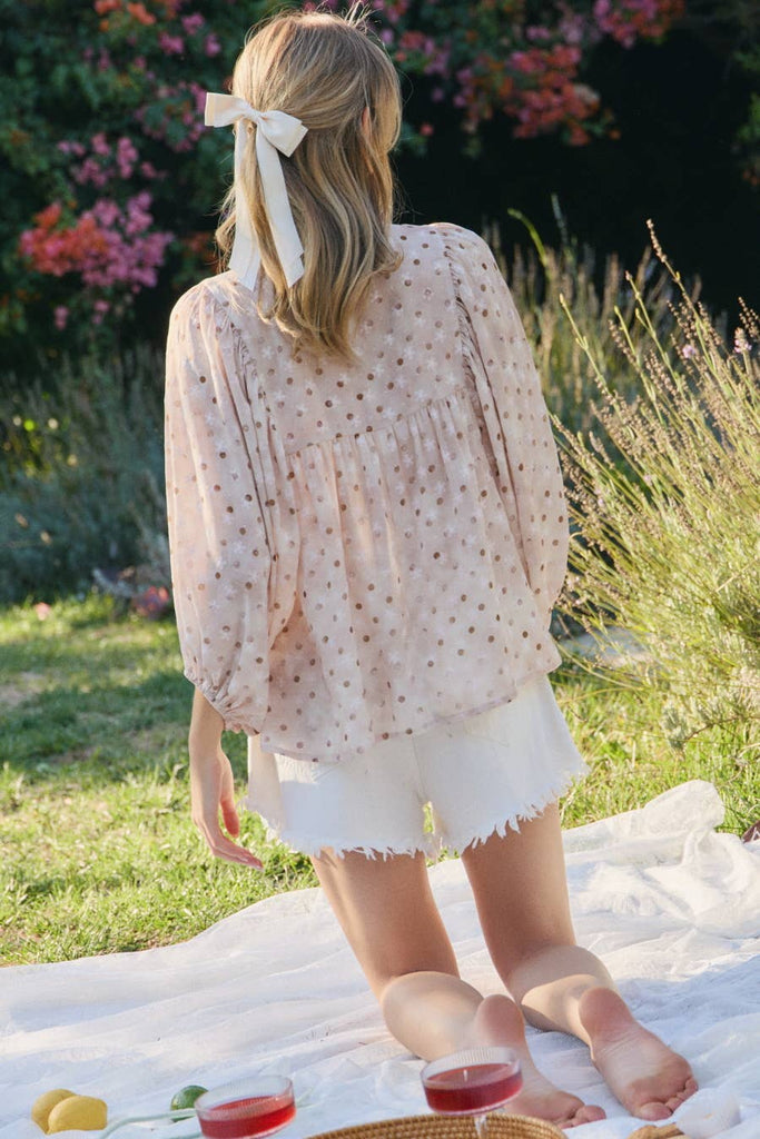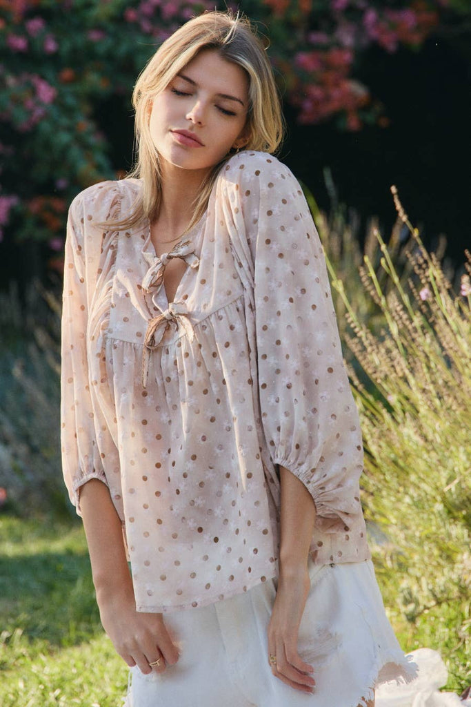 The Speckled Spring Tie Top in Mocha features a polka dot and floral design, complemented by billowed quarter sleeves. This blouse is an essential addition for spring, offering a blend of style and comfort for various occasions. Its unique pattern and cut enhance airflow, promoting breathability while maintaining a polished look.