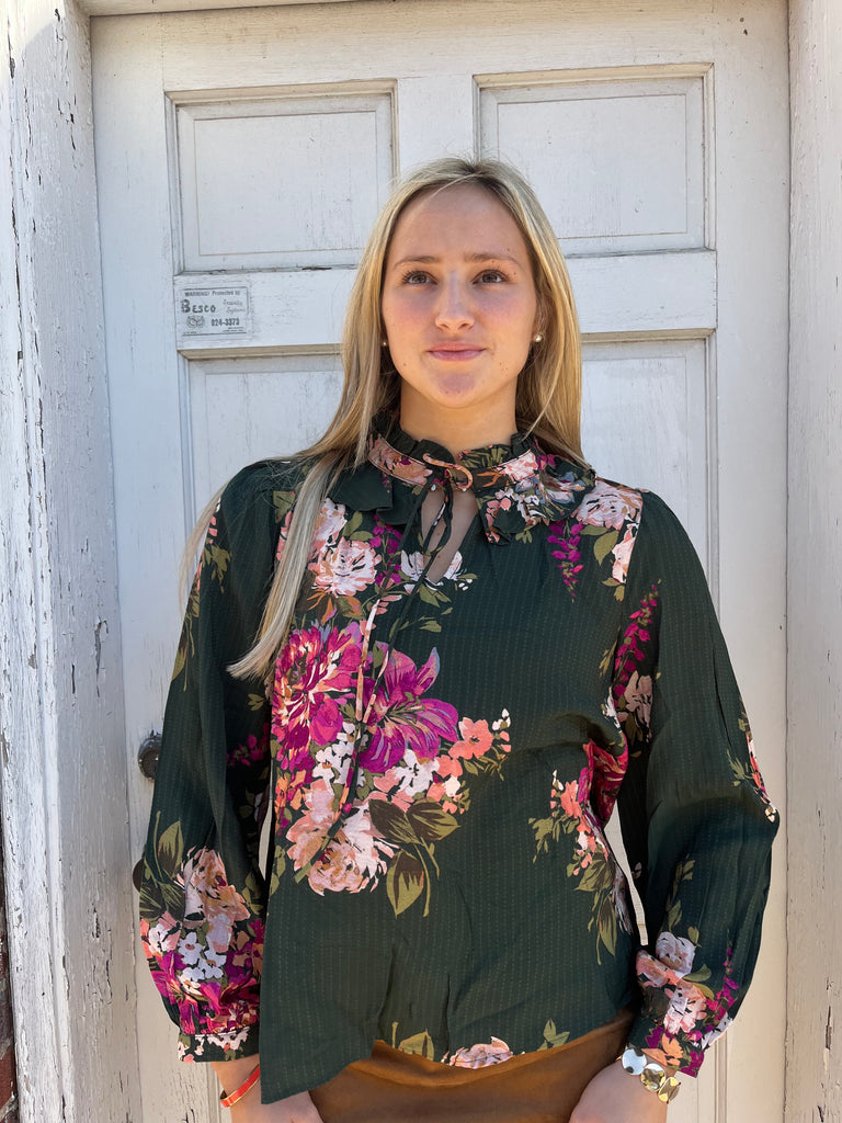 Floral printed long-sleeve blouse featuring feminine tie detail and ruffled neckline. Also available in sizes 1XL to 3XL: Style no. IT18399P. Total Length: 24" Content: 85% Rayon, 15% Nylon