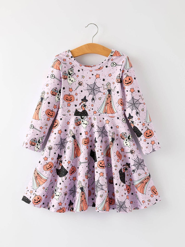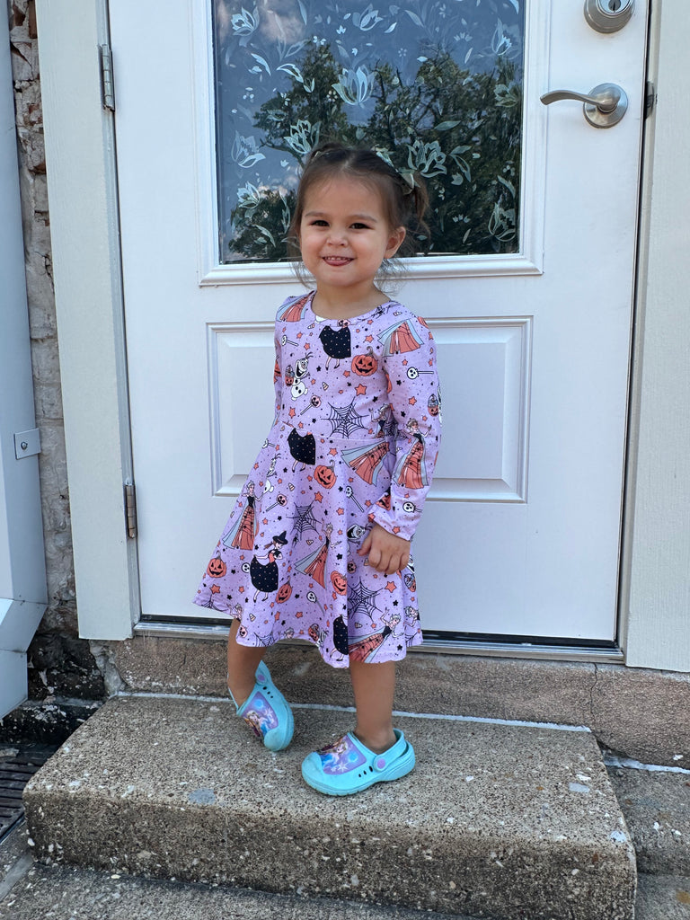 Dress your little one in festive fun with this Purple Halloween Themed Dress, featuring playful spiders and pumpkins. Crafted for toddlers, it offers a comfortable fit that lets her move freely while celebrating the spooky season in style. Perfect for parties, trick-or-treating, or everyday wear during October, this dress blends holiday charm with cozy wearability. Make her Halloween outfit truly unforgettable with this adorable and spirited dress.