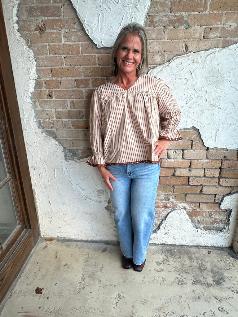 A feminine blouse with timeless charm. Featuring vertical stripes, a flattering v-neckline, and delicate lace trim at the hem and sleeves, this top flows effortlessly with every move. Dress it up with trousers for work or pair it with denim for a weekend chic look—either way, it’s an instant favorite.
