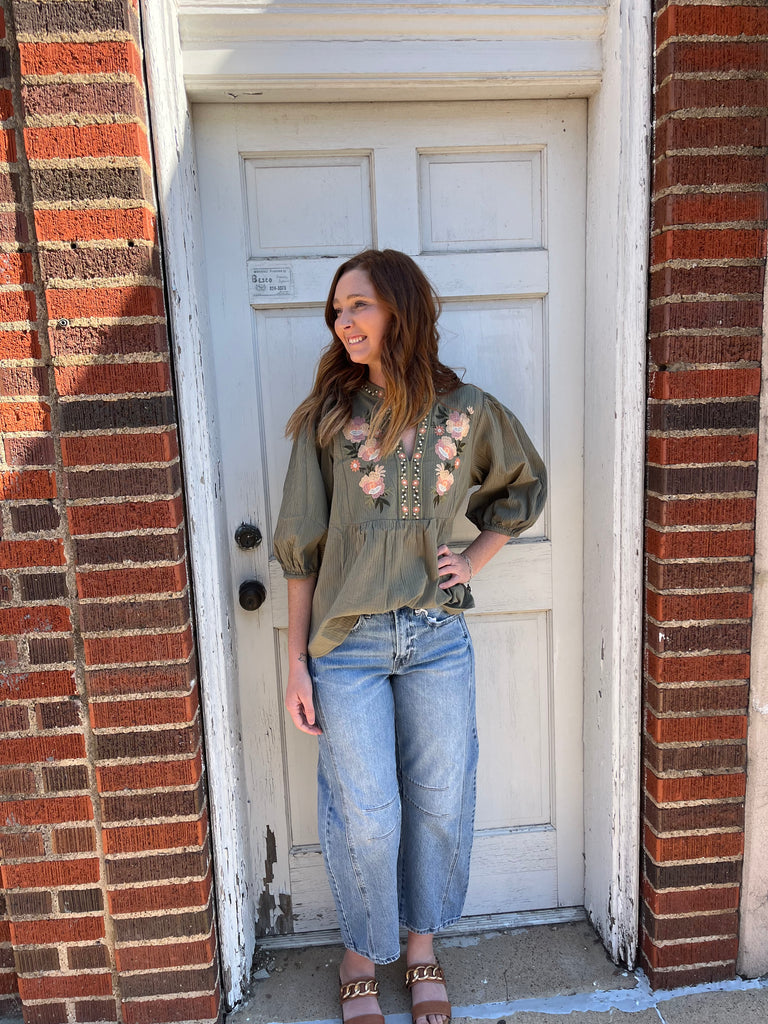 Textured blouse with embroidered front yoke and neck band with 3/4" sleeve. Introducing the Wildflower Whisper Top in Olive. This top features long sleeves, creating a versatile and stylish addition to your wardrobe. The lightweight fabric and elegant design provide both comfort and sophistication, making it perfect for any occasion. Elevate your look with this must-have top. Total Length: 25" Content: 65% Cotton, 35% Polyester