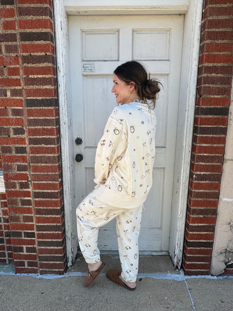 Cowboy motif printed french terry cargo jogger pants with elastic cuffs. Total Length: 38" Content: 65% Cotton, 35% Polyester